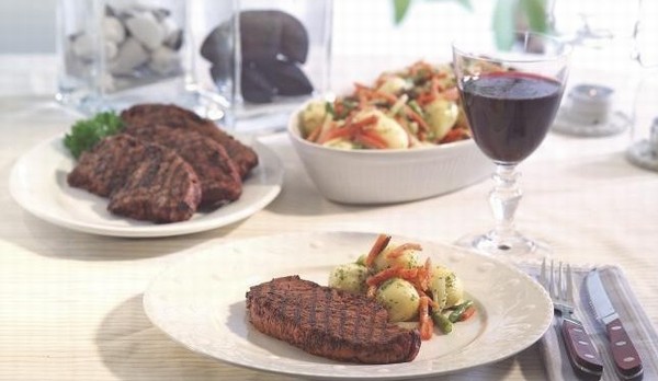 1 mar. kyllingefilet, 1 mar. bøf af oksefilet, 1 stor hjemmelavet frankfurter, kold hjemmelavet kartoffelsalat, tomat...