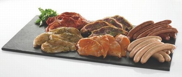 1 mar. kyllingefilet, 1 stor hjemmelavet frankfurter, 1 mar. nakkekotelet, kold hjemmelavet kartoffelsalat, pastasala...