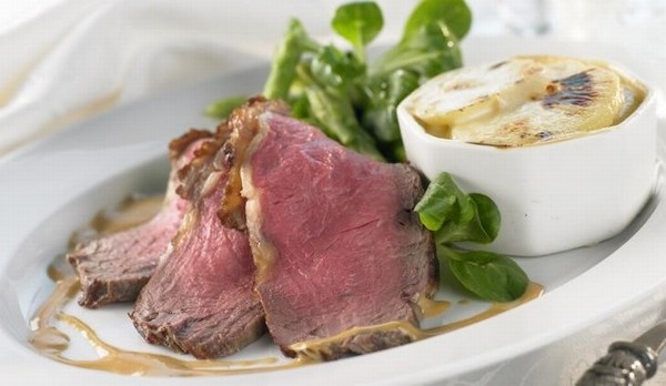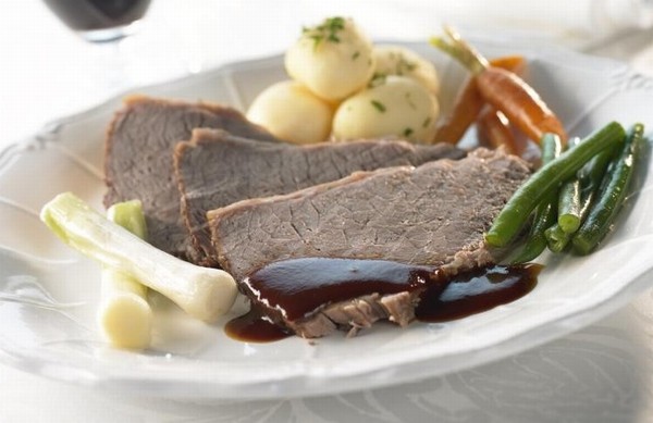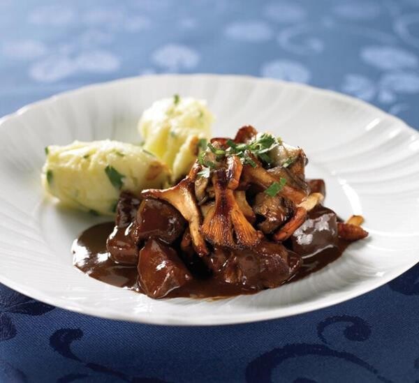 m/champignon, bønner, karotter, ristede kartofler og rødvinssauce...