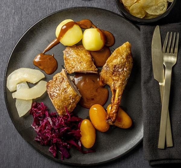 m/hvide- og brunede kartofler, rødkål, franske kartofler og andesauce ...