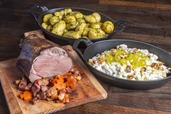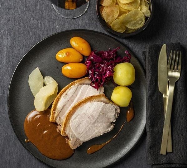 m/ristede kartofler, rustikke rodfrugter, rødkålsalat og sauce