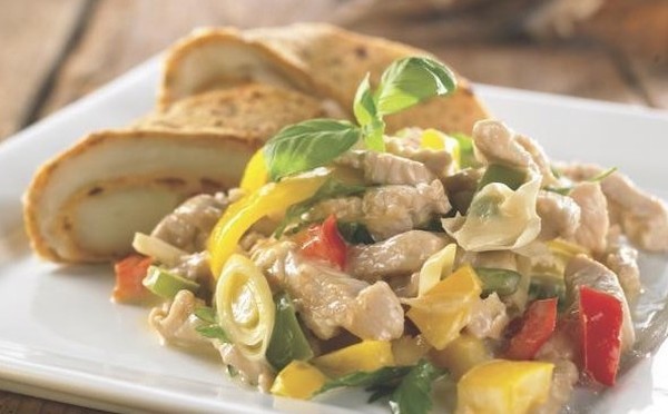 m/ bl. pesto, hvidløg og soltørret tomater. Dertil råstegte kartofler, tomatsalat, flütes og pikantsauce...