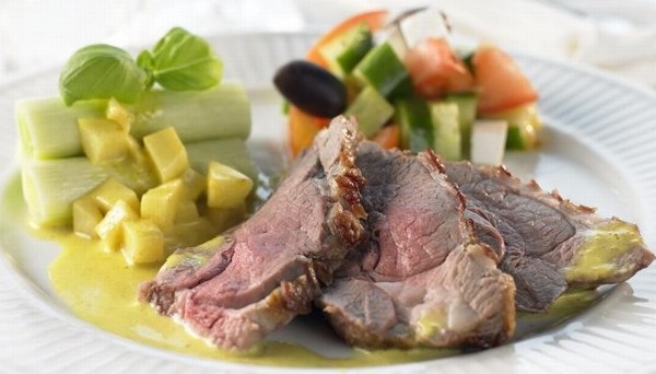 m/krydderrissolleés (ristede kartofler), blomkålssalat m/ æbler og saltmandler og smørsauce ...