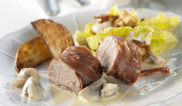 svøbt med gourmetbacon, smørstegte kartofler, melonsalat m/ dressing og skysauce...